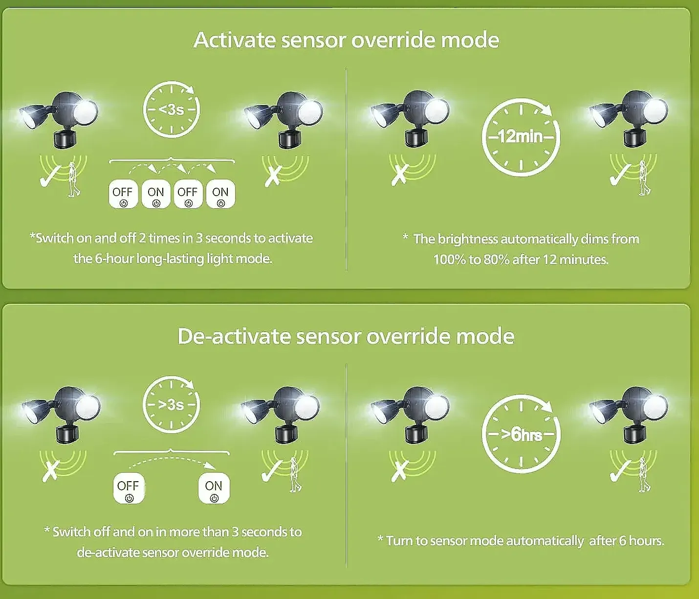 - Four lighting modes: Test, Security, Dusk-to-Dawn, and Manual Override