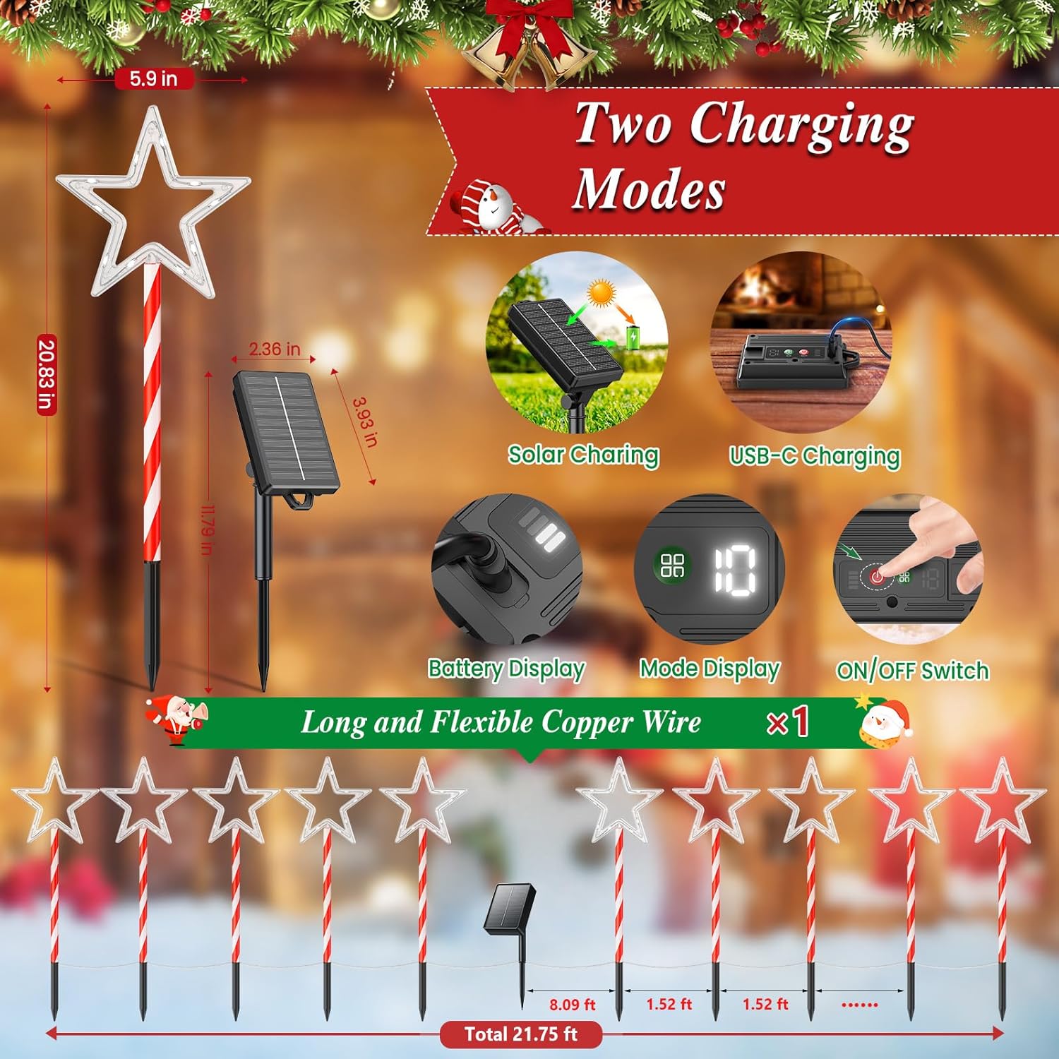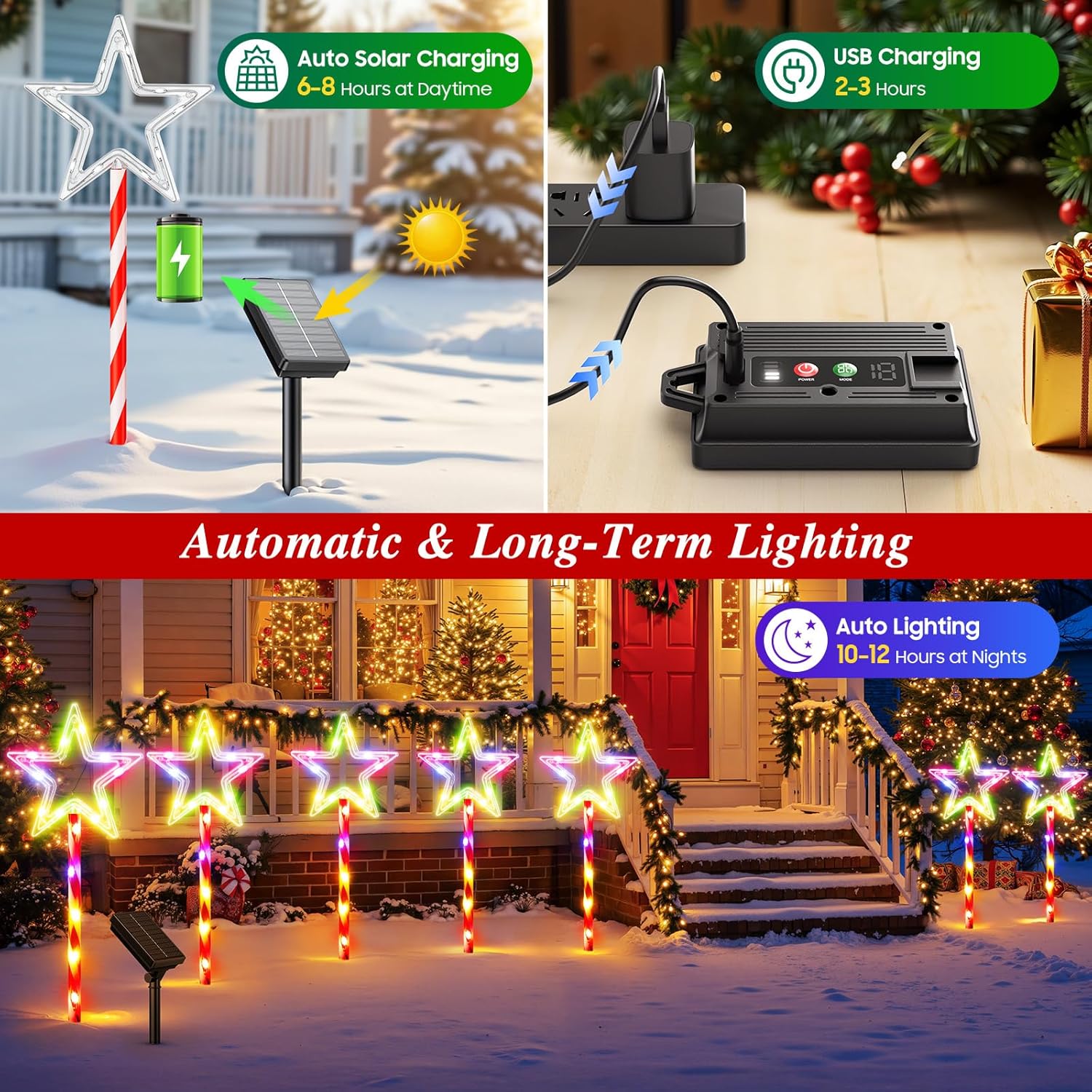 This set includes multiple star-shaped pathway stakes that emit vibrant colors through high-quality LEDs. With 10 one-of-a-kind lighting modes and dual charging options, these outdoor holiday lights offer versatility and convenience. Their waterproof construction makes them suitable for use in winter weather, while the simple installation process allows anyone to create a beautiful holiday display.