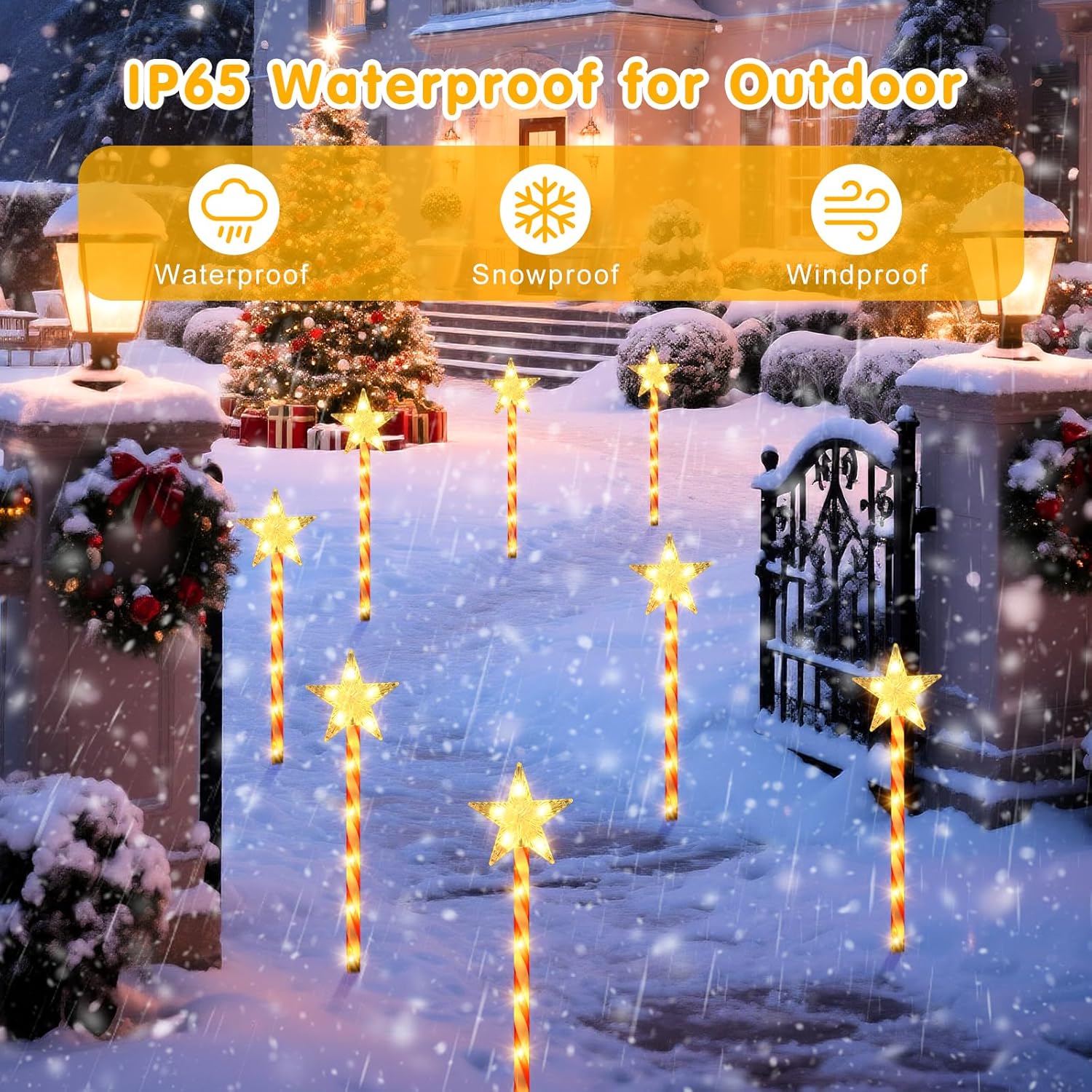 These solar star candy cane pathway lights offer a bright and festive way to outline walkways and outdoor areas. The warm LEDs create a holiday atmosphere with minimal effort. The eight lighting modes provide flexibility for different scenes. Their IP65 structure supports use in harsh winter conditions. With solar charging and quick installation, this set offers a simple yet striking option for outdoor Christmas décor.
