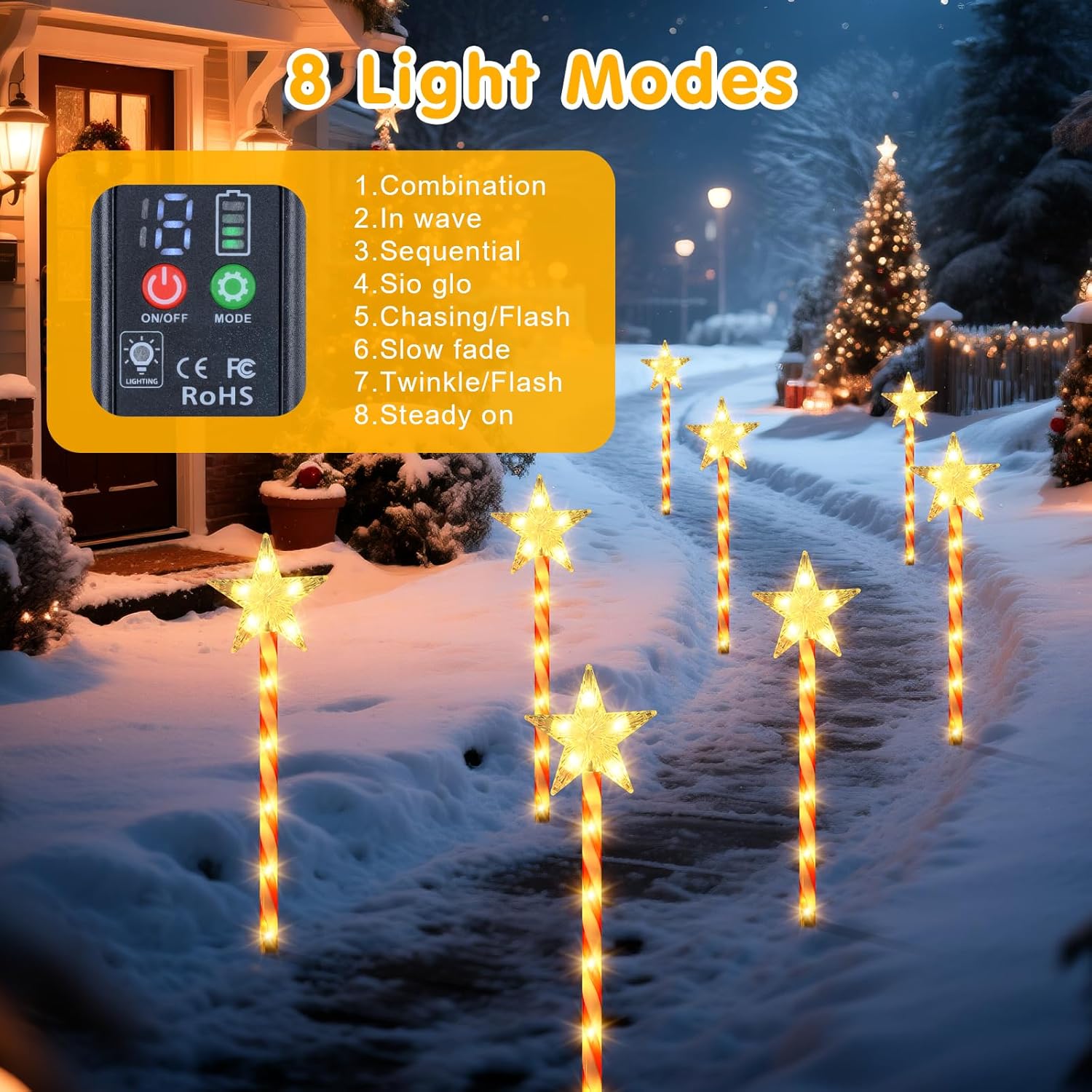 Each pathway stake includes 80 LEDs arranged along the pole for a bright evening effect. The built-in 1200mAh battery charges during daylight hours and supports 8 to 10 hours of illumination after a full charge. The lights activate automatically at dusk and switch off during daylight through an internal sensor. With eight lighting modes, these solar star candy cane pathway lights offer several visual styles for the holiday season.