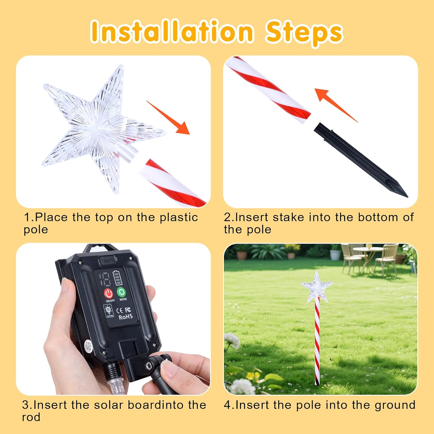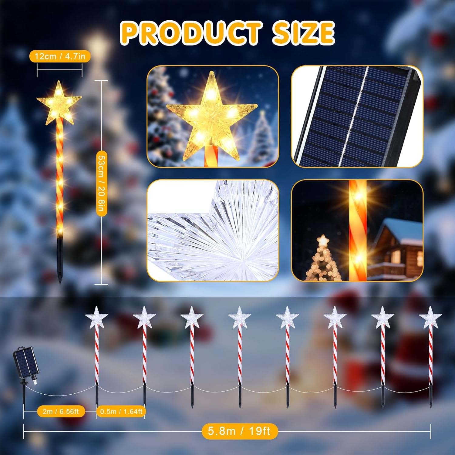 Made with high-quality plastic, the set has an IP65 rating. Each stake continues working through rain, snow and frost. Installation is simple, requiring only a few steps. Insert the ground stake, place the pole, attach the star and position the solar panel toward direct sunlight. The set fits well in holiday decorating themes and offers strong visual impact for evening displays.
