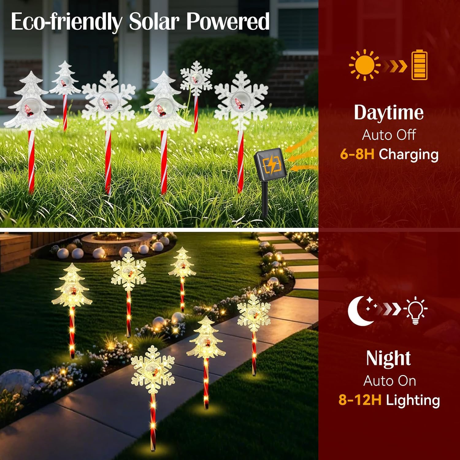These lights operate through an automatic day and night cycle. During the daytime, the panel gathers sunlight for internal charging, and during low-light periods, the lights activate independently. Multiple lighting modes support steady or flashing patterns depending on the model. Designed for outdoor environments, the Solar Christmas Pathway Light provides a structured arrangement suited for holiday displays along yards, porches, or driveways.