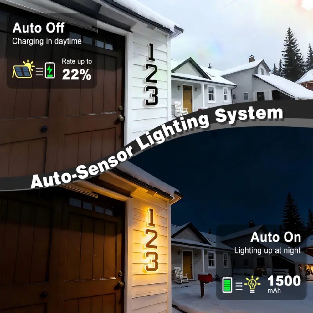This solar LED address sign uses high-efficiency solar charging technology. During daylight hours, the integrated panel absorbs sunlight and stores energy in a built-in rechargeable battery. Once ambient light decreases, the automatic sensor activates the LED illumination.